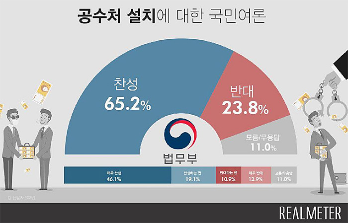조사 결과, 공수처 설치는 응답자의 65.2%가 찬성 의견을 보였다. 반대 의견은 23.8%에 그쳤다. 특히 매우 찬성은 절반에 가까운 46.1%에 달했다. 또 국민 10명 중에서 약 6명은 기소권이 없는 공수처에는 반대하는 것으로 나타났다. 최근 여당은 공수처에 기소권을 부여하는 방안에 동조하고 있다.