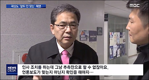 26일 MBC <뉴스데스크> 보도 중 일부다. 최근 검찰 진상조사단의 조사 결과에 의해 당시 청와대 민정 수석실이 국과수 측에 김학의 별장 동영상과 감정결과를 직접 보여달라고 요청한 사실이 드러났다. 청와대가 불법적으로 수사에 개입 혐의에 대한 핵심적인 정황이라 할 수 있다. 이에 대해 곽상도는 MBC에 이렇게 말했다.